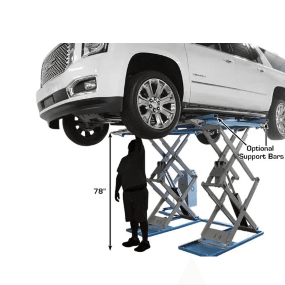 - Full-Rise Scissor Lift (78” Max Height) – Provides ample clearance for undercar repairs, wheel service, and maintenance.