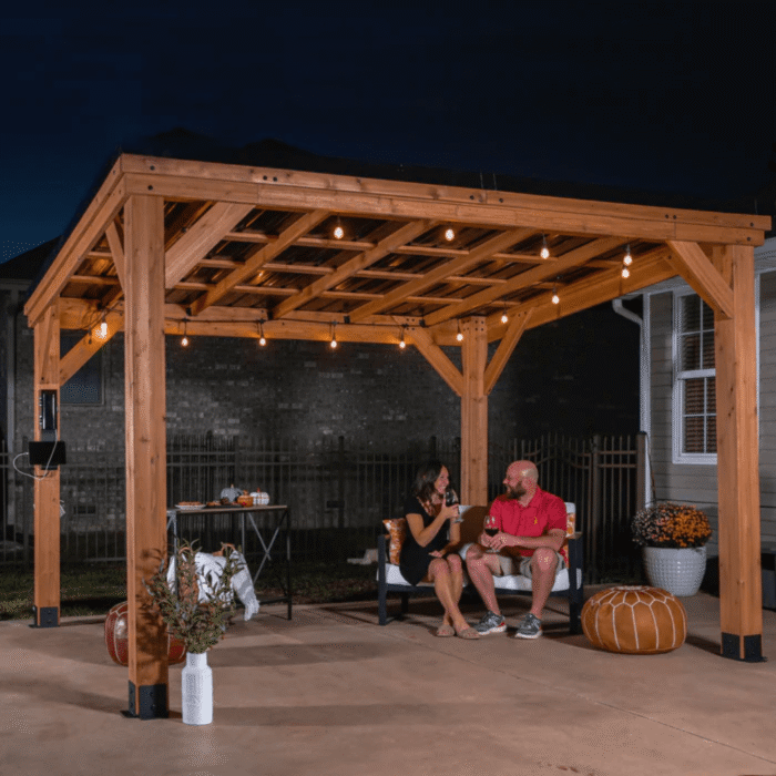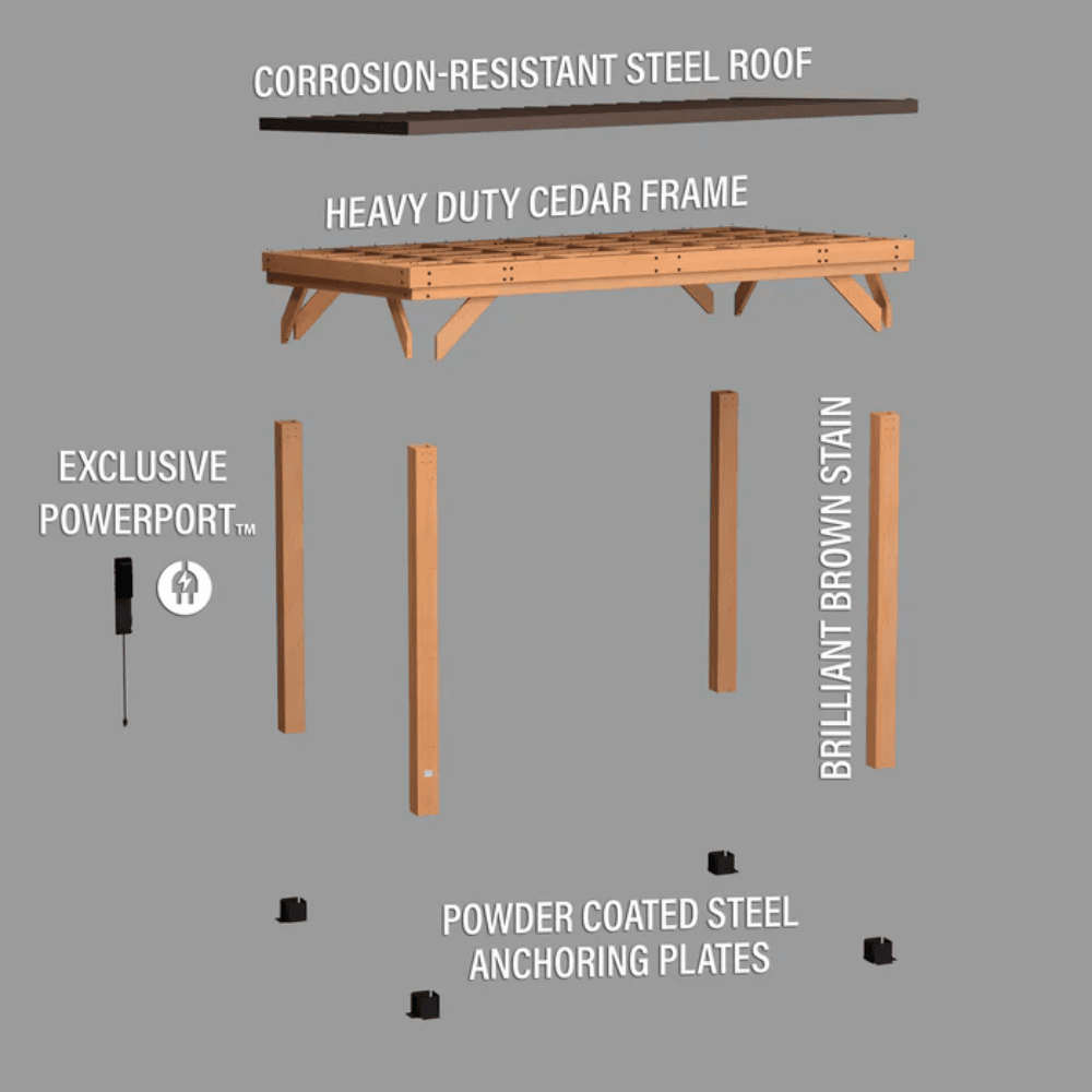 Transform your outdoor space with the Backyard Discovery 12′ x 9.5′ Arcadia Gazebo, designed for long-lasting durability, modern style, and all-season functionality. With a heavy-duty steel roof, solid cedar wood frame, and built-in PowerPort™, this PRO-TECT™ Tested & Proven structure offers exceptional protection, shade, and convenience. Whether you’re using it as a shaded retreat, outdoor dining area, or entertainment hub, the Arcadia Gazebo is built for strength and elegance.