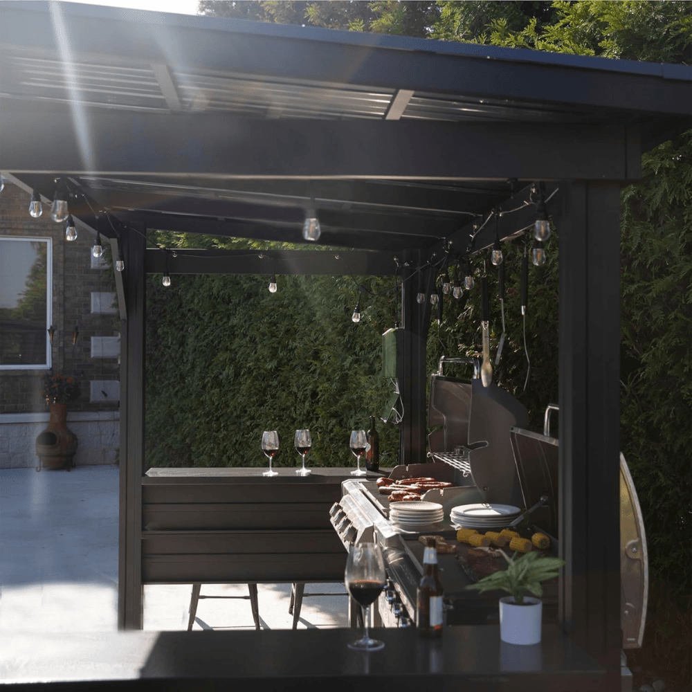 - Designed for year-round outdoor cooking, providing shade and protection from the elements.