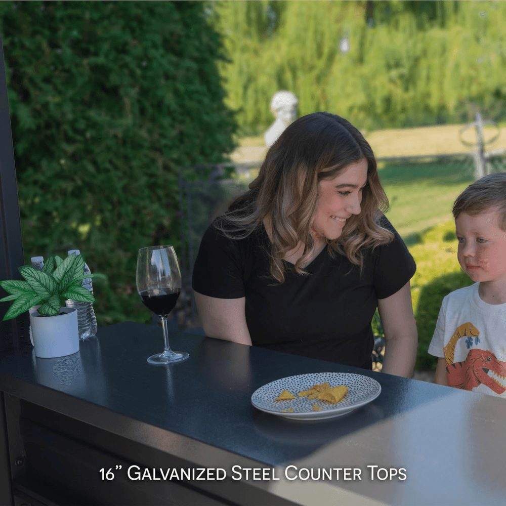 - Two seamless 16” galvanized steel bar tops provide ample space for prepping, serving, and entertaining.