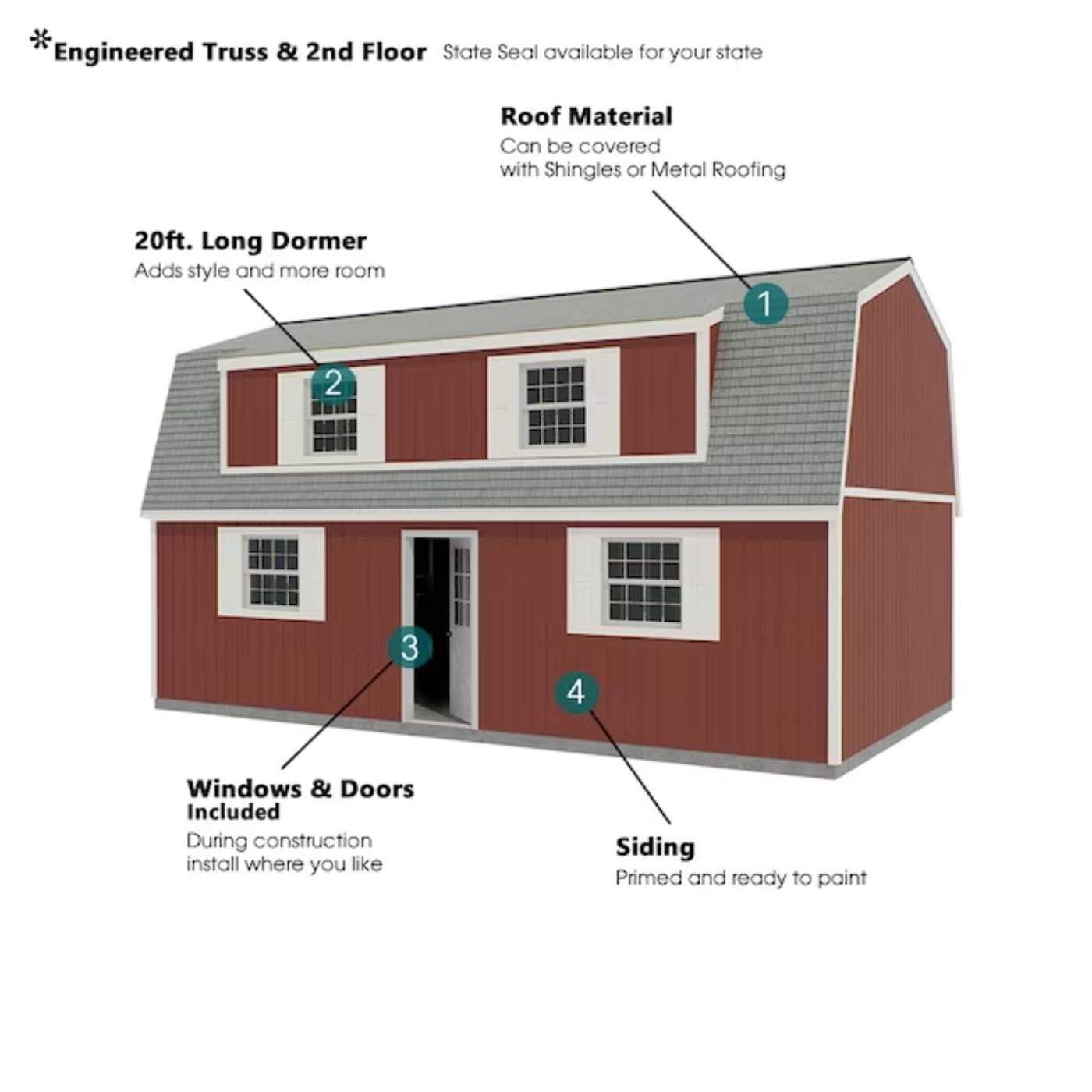- Roof Type: Gambrel Roof with 20ft Dormer