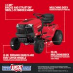 Its 36-inch reinforced stamped steel deck is ideal for properties up to one acre and is compact enough to fit through most gates and tight spaces. Whether you’re mowing around trees, fences, or landscaping, the 18-inch turning radius and Turf Saver wheels ensure smooth, precise navigation. The included mulch kit enhances lawn health by returning nutrient-rich clippings back into the soil, eliminating the need for bagging.