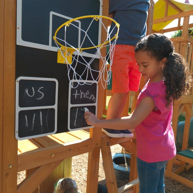 The Mockingbird View Playset by KidKraft is packed full of exciting play options and big enough for the whole neighborhood gang to explore Designed to accommodate lots of energetic little ones, this playset features a spacious lookout tower with a telescope, an adventure tower with a shaded canopy and an activity center with a bag toss and basketball hoop. Kids are invited to enjoy thrilling rides down the 12-foot twist-n-ride tube slide or the high rail wave slide. They’ll learn to participate in cooperative play as they take turns crawling through the 6-foot tunnel that connects the two towers. Promote confidence and independence in kiddos as they climb the vertical rock wall or swing on the two belt swings. A durable, weather-resistant tire swing offers classic fun while promoting teamwork as kids work together to swing high. After twirling on the acro bar with grips, little ones can get dirty underneath the adventure tower as they build castles in the shaded sandbox—so much fun that even mom and dad might want to join! Little hands will love squishing, splashing and playing with sand, water and more in the interactive station. Built with premium wood and treated with a child-friendly water-based stain, the KidKraft Mockingbird View Playset is designed to be aesthetically beautiful, strong and sturdy so that kids can enjoy this ultimate play destination for years!