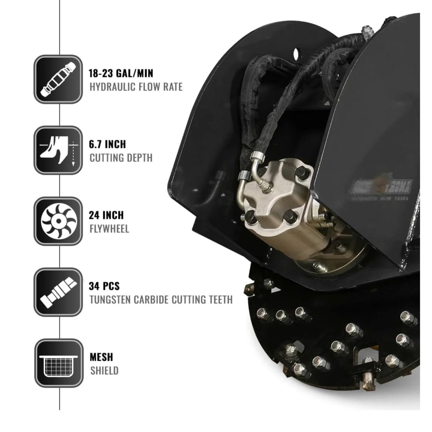 - 34 bolt-on, replaceable carbide steel teeth