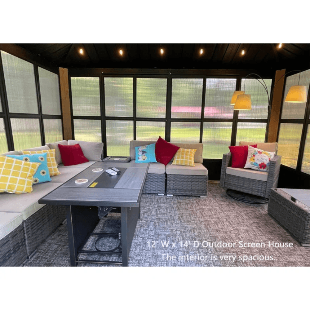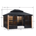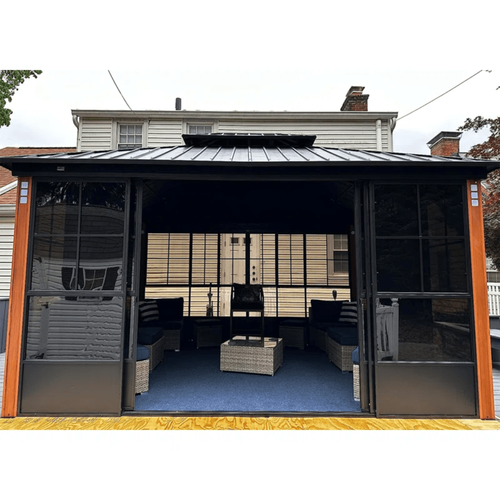 Transform your backyard into a luxurious and versatile outdoor space with this Hardtop Gazebo & Sunroom. Designed for all-season enjoyment, this structure offers privacy, protection, and elegance, making it ideal for hosting guests, relaxing, or creating a cozy backyard retreat. The double-tier galvanized steel roof ensures optimal ventilation while shielding you from the elements, and the durable aluminum frame with sliding doors provides long-lasting stability.