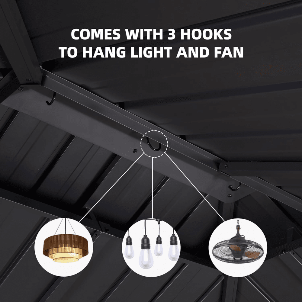 - Integrated ceiling hook allows for hanging lights, fans, or grilling tools.