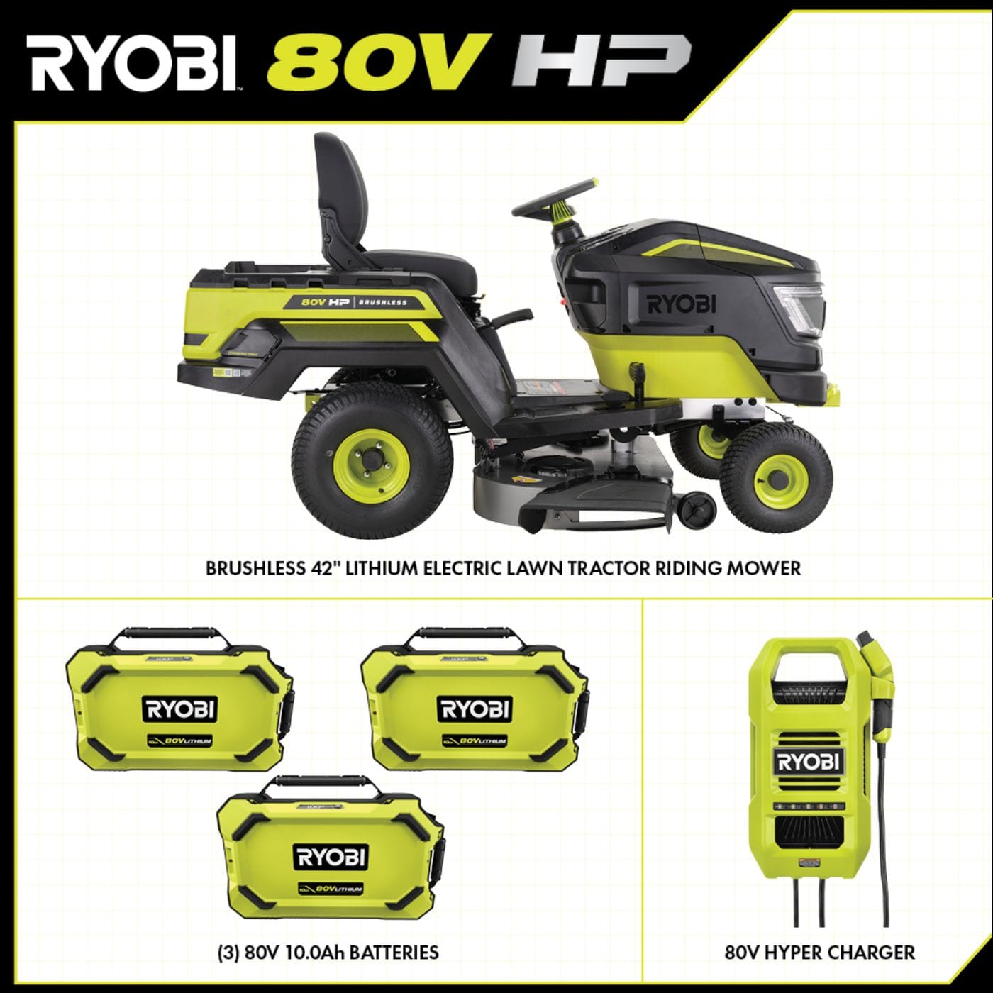Ryobi 80V HP Brushless 42 in. Battery Electric Cordless Riding Lawn Tractor with 80V 10Ah BatteriesĀ andĀ Charger