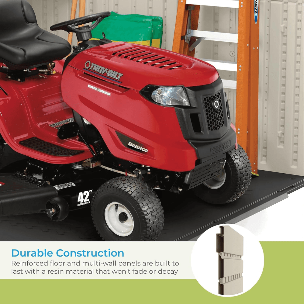 Keep your outdoor space organized and clutter-free with the Suncast Vanilla Resin Storage Shed. Designed for strength, durability, and convenience, this spacious multi-wall resin shed offers ample storage space for power equipment, tools, bicycles, ladders, and other outdoor essentials. Built with weather-resistant polypropylene resin panels and a reinforced heavy-duty floor, this shed provides long-lasting protection against the elements while supporting heavy-duty storage needs.