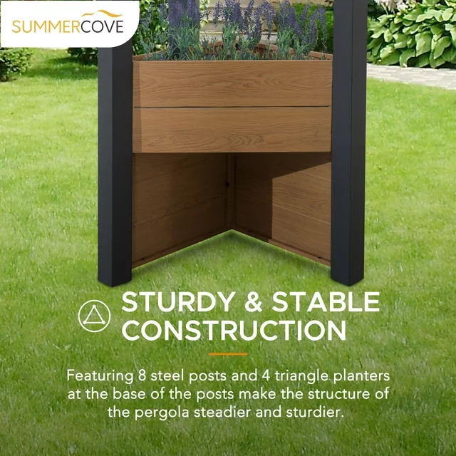 The pergola comes with a triangular steel planter in each corner, which is perfect for flowers while adding creative decorative space to this open air pergola. - Stylish Design
